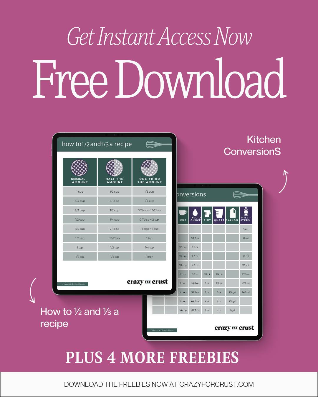 6 pages of FREE printables, including kitchen conversions, how to 1/2 a recipe, baking substitutions and MORE